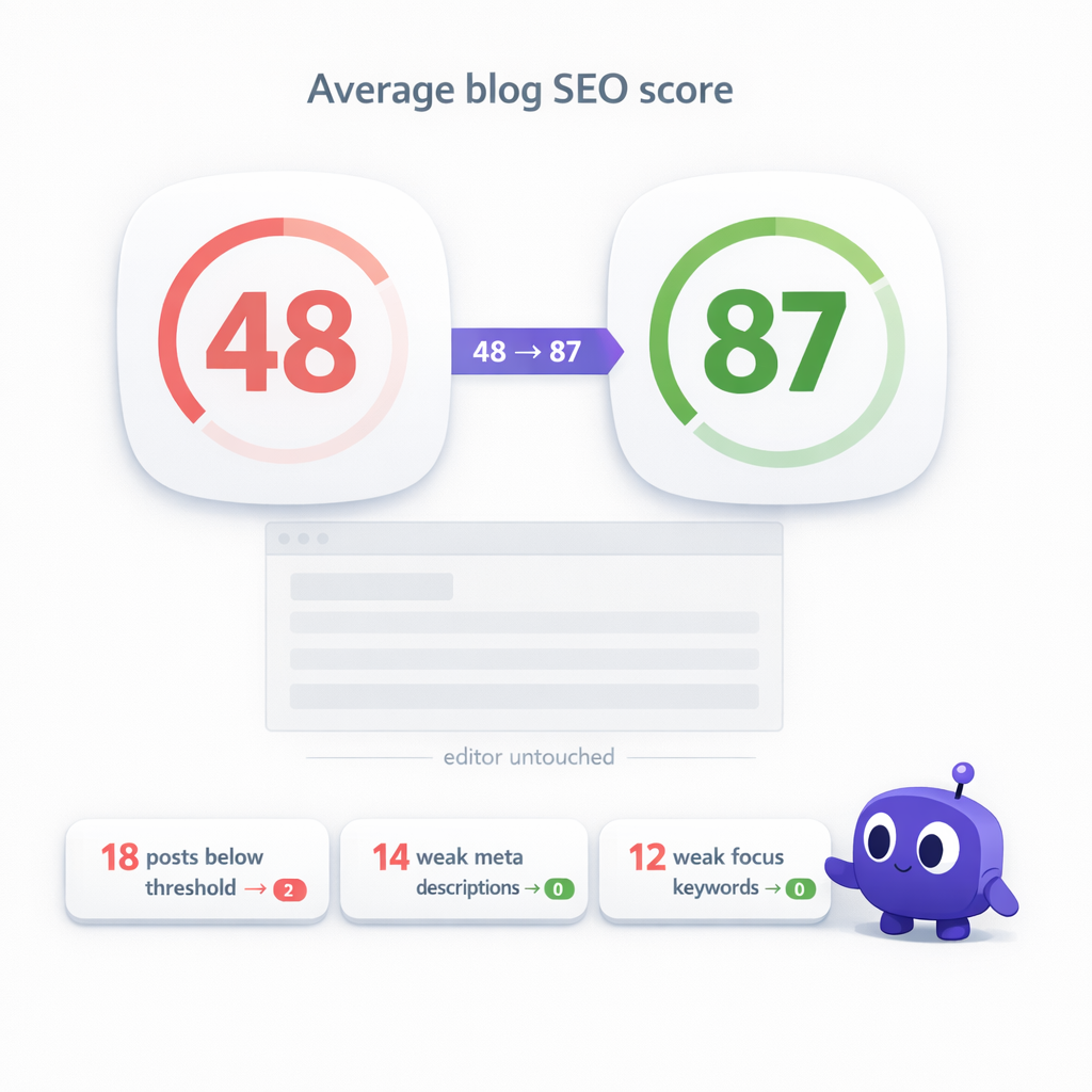 The real problem was that I was treating every weak SEO score like a writing problem inside the editor. Sometimes it was. Most of the time it was not. A lot of those posts already had decent structure and useful content. What they did not have was consistent metadata, clear focus keywords, or a reliable rerank cycle after edits.