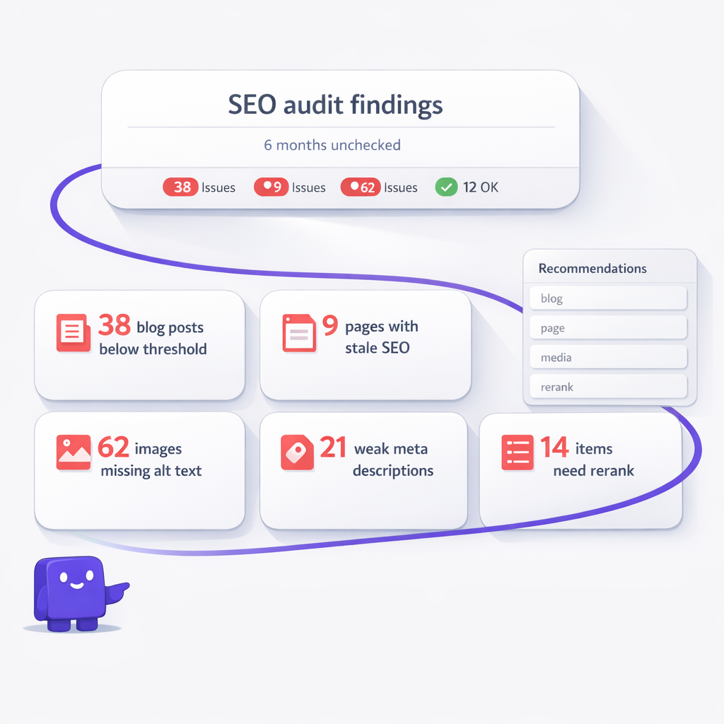 I wasn’t. What I was really doing was spot-fixing the newest problems while old ones piled up in the background. A post with a weak meta description. A service page I’d edited twice but never reranked. Images with missing alt text because I uploaded them fast and moved on. Bits of SEO metadata that were not technically empty, just clearly written in a hurry.