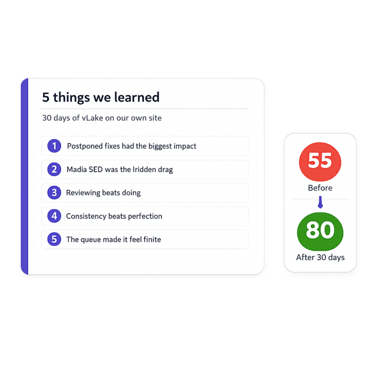 vLake broke that backlog into something I could finally read. Low-scoring content was flagged. Weak metadata was surfaced. Media SEO gaps showed up next to post and page issues instead of living in some separate mental bucket I never got around to checking.