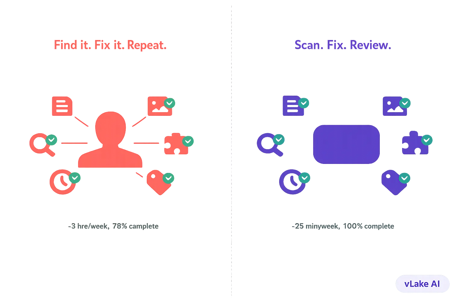 An autonomous agent closes this gap by handling both sides. The scanner identifies the issue. The execution layer fixes it. The result lands in a review queue for you to approve. You’re not doing the work. You’re approving the work. That takes a fraction of the time and none of the context-switching.