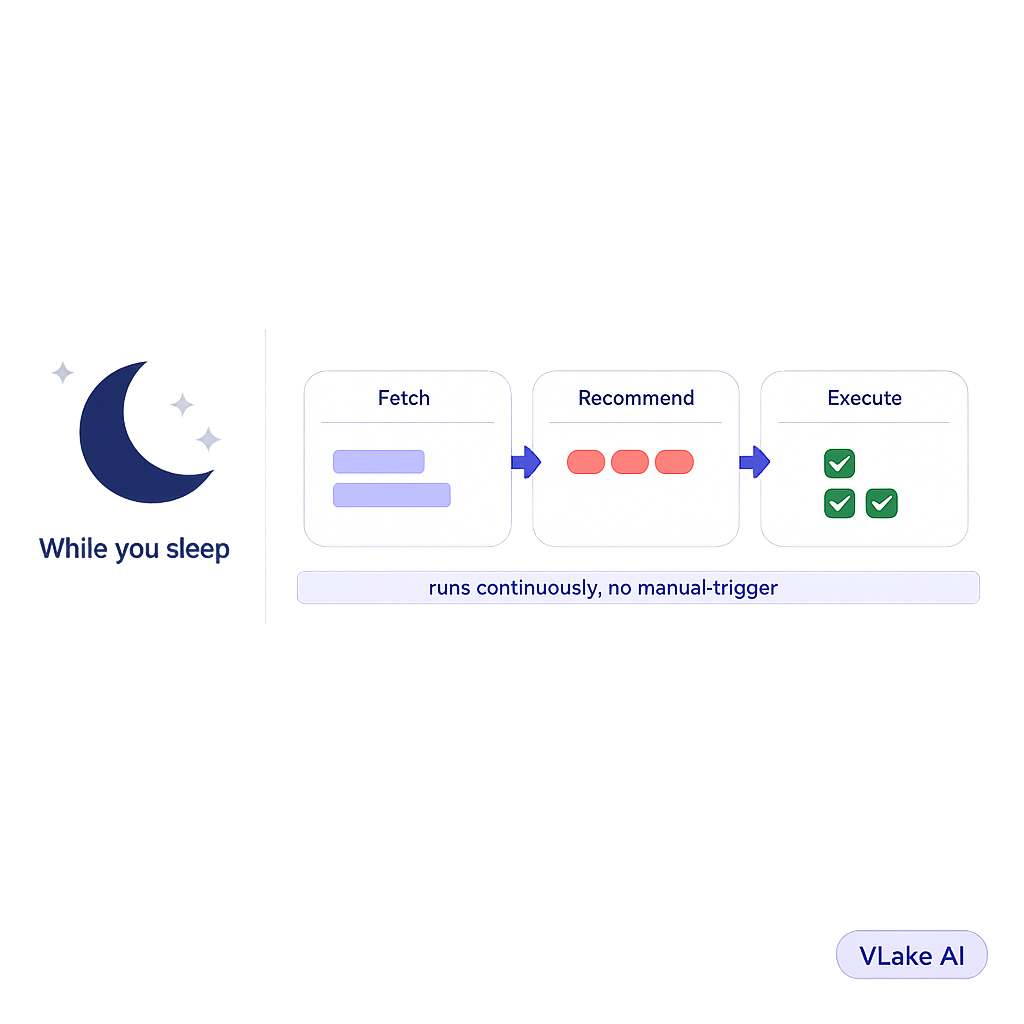 All of this happens on a schedule. Fetch runs daily. Recommendations generate automatically. Executions process the queue continuously. I don’t trigger any of it.