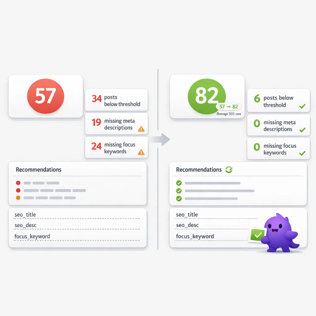 Every week I had the same little pile of tasks waiting for me. Open Rank Math. Check which posts had weak scores. Rewrite a few meta descriptions. Add a focus keyword I meant to add when I published. Notice an older post still had no proper SEO title. Promise myself I’d clean up the archive on Friday. Then not do it.