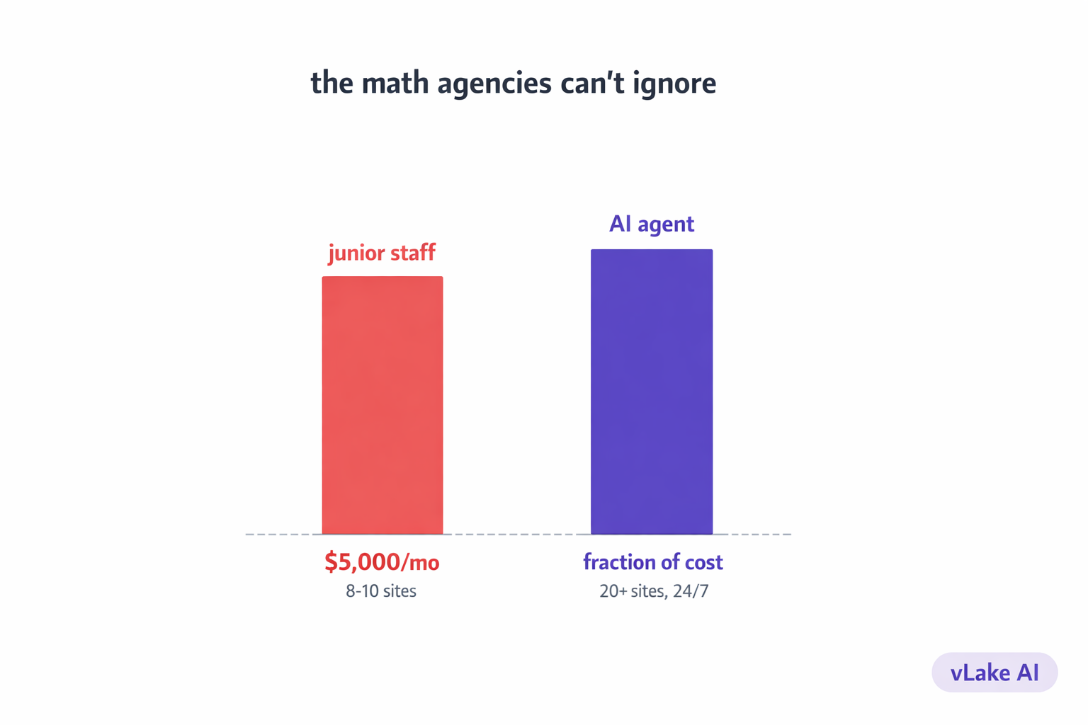 An AI agent connected to 20 sites costs a fraction of that monthly. It runs 24/7. It does not take time off. It does not need training on each new client because the scanner learns the site on connection. It does not quit.
