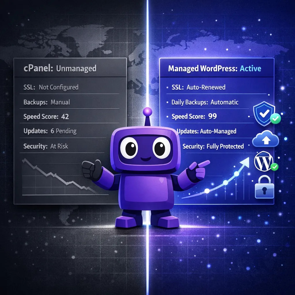 Manage your digital presence effortlessly. Use our clean control panel to deploy new WordPress sites, monitor resource usage, control site status, and manage backups all in one place.